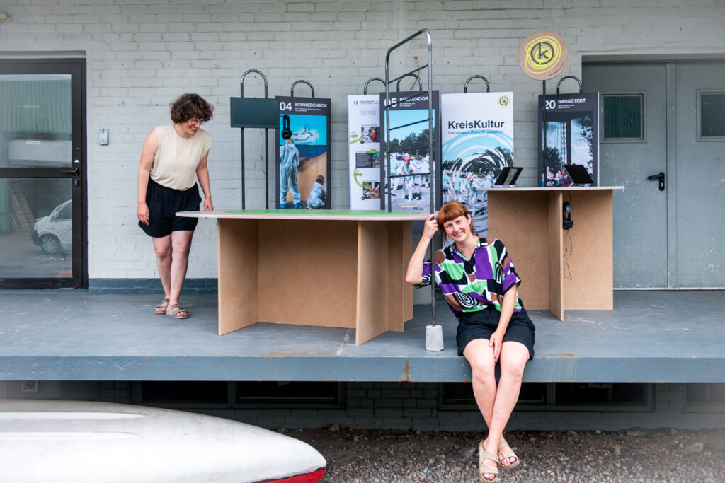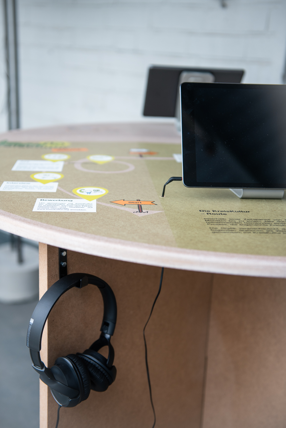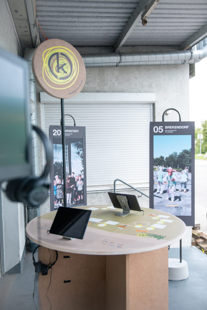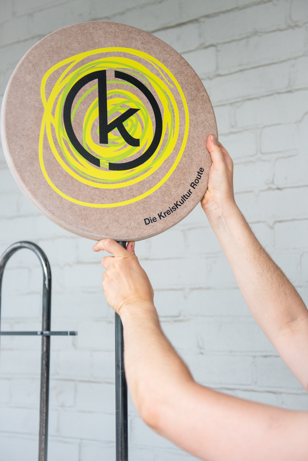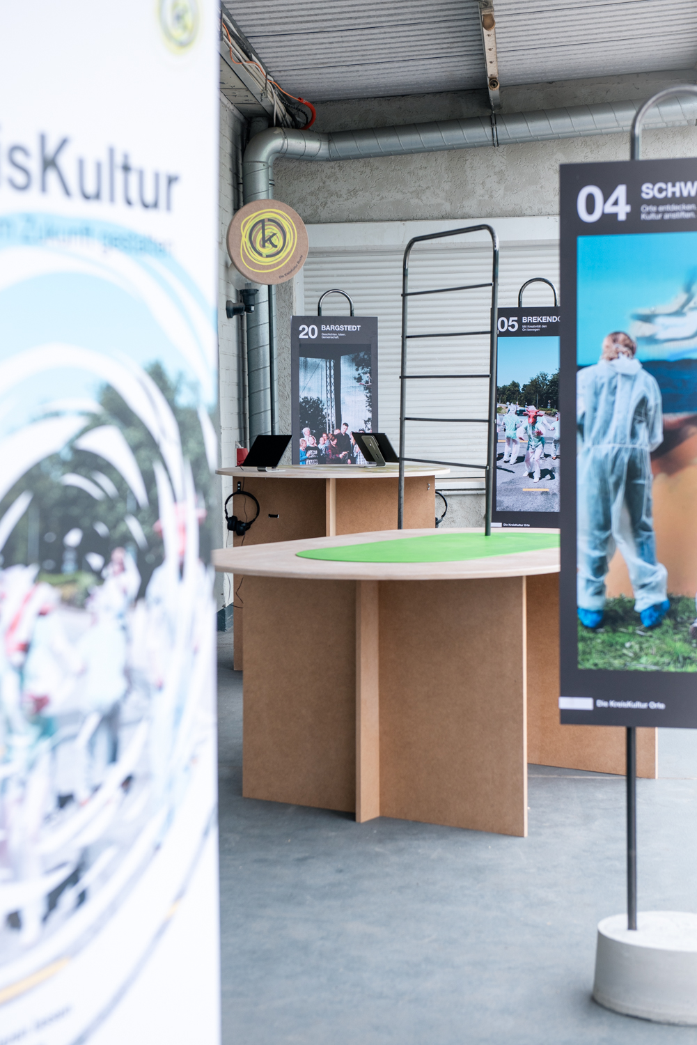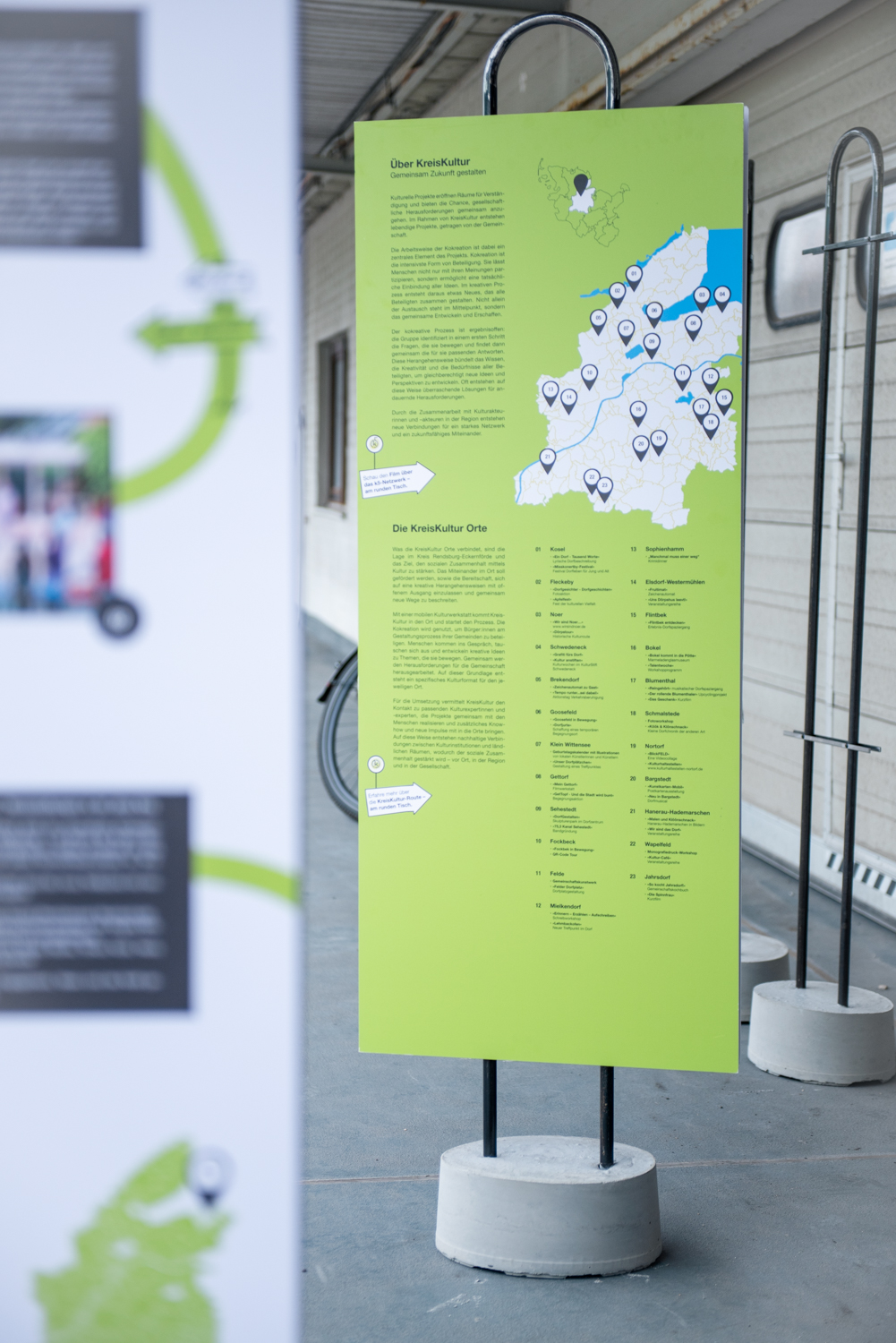 Eine Wanderausstellung für KreisKultur erzählt von den Projekten, die in 23 verschiedenen Dörfern Schleswig-Holsteins die Menschen zusammenbringen und mehr Miteinander und Selbstwirksamkeit stiften. Die Ausstellung besteht aus verschiedenen Elementen, welche kompakt in einen VW Bus auf die Reise gehen werden: Stellwände aus gebogenem Stahlrohr und Betonfuss dienen als Halterungen für bedruckte Wechsel-Tafeln sowie Video Technik. Ein großer steckbarer Tisch aus MDF mit grüner Innenfläche und Display für Bilder, Zeichnungen und Flyer dient als Spielfeld und Mitmachstation. Ein steckbarer bedruckter Tisch erzählt von der Kreiskultur Route (den Methoden und dem Ablauf in den Dörfern) sowie den Projektpartnern. Displays mit Kopfhörern zeigen verschiedene Filme. Ein „Logo-Lolli“ aus bedrucktem MDF markiert den Mittelpunkt der Ausstellung.